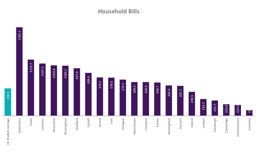 从城市细分来看,在家庭账单方面(水、电、网、天然气等开销),坎特伯雷的支出最多,每月达182.1英镑,支出较少的几个城市包括剑桥、南安普顿和考文垂(均不足30英镑每月)。
