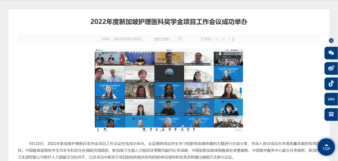 据中国留学网9月30日消息,23日,2022年新加坡护理医科奖学金项目工作会议在线成功举办。