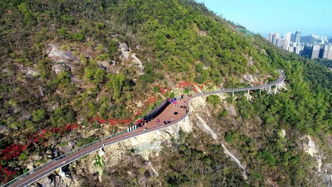 在景山道上,市民可以环板樟山而行,漫步在海拔160-180米的山上,俯瞰城市风光、山海景色,游览3座独具特色的景观桥,打卡全新的城市景观。