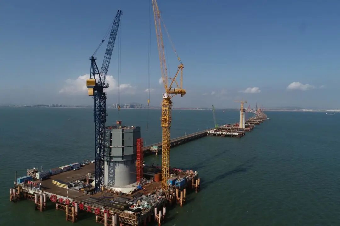 ▲施工中的黄茅海跨海通道主桥主塔。珠海传媒集团 李建束 摄