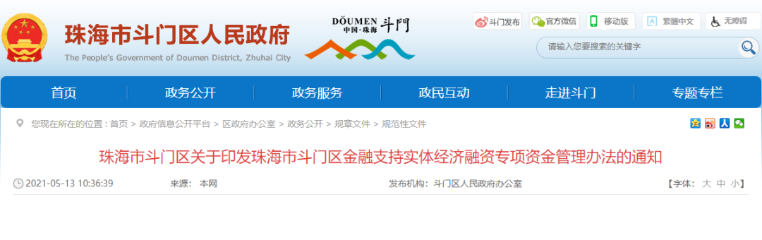 为进一步强化金融支持实体经济,推动金融资源与中小微企业资金需求的有效对接,优化民营中小微企业金融服务,2021年4月22日,珠海市斗门区人民政府出台了《珠海市斗门区金融支持实体经济融资专项资金管理办法》(以下称《管理办法》),在斗门区范围内,通过设立年度总规模为2000万元的金融支持实体经济融资专项资金,向符合条件的企业提供融资增信及贷款贴息补贴,降低企业融资成本,推动中小微企业利用银行信贷实现更好更快发展。《管理办法》自2021年5月22日起实施,有效期至2024年5月21日。