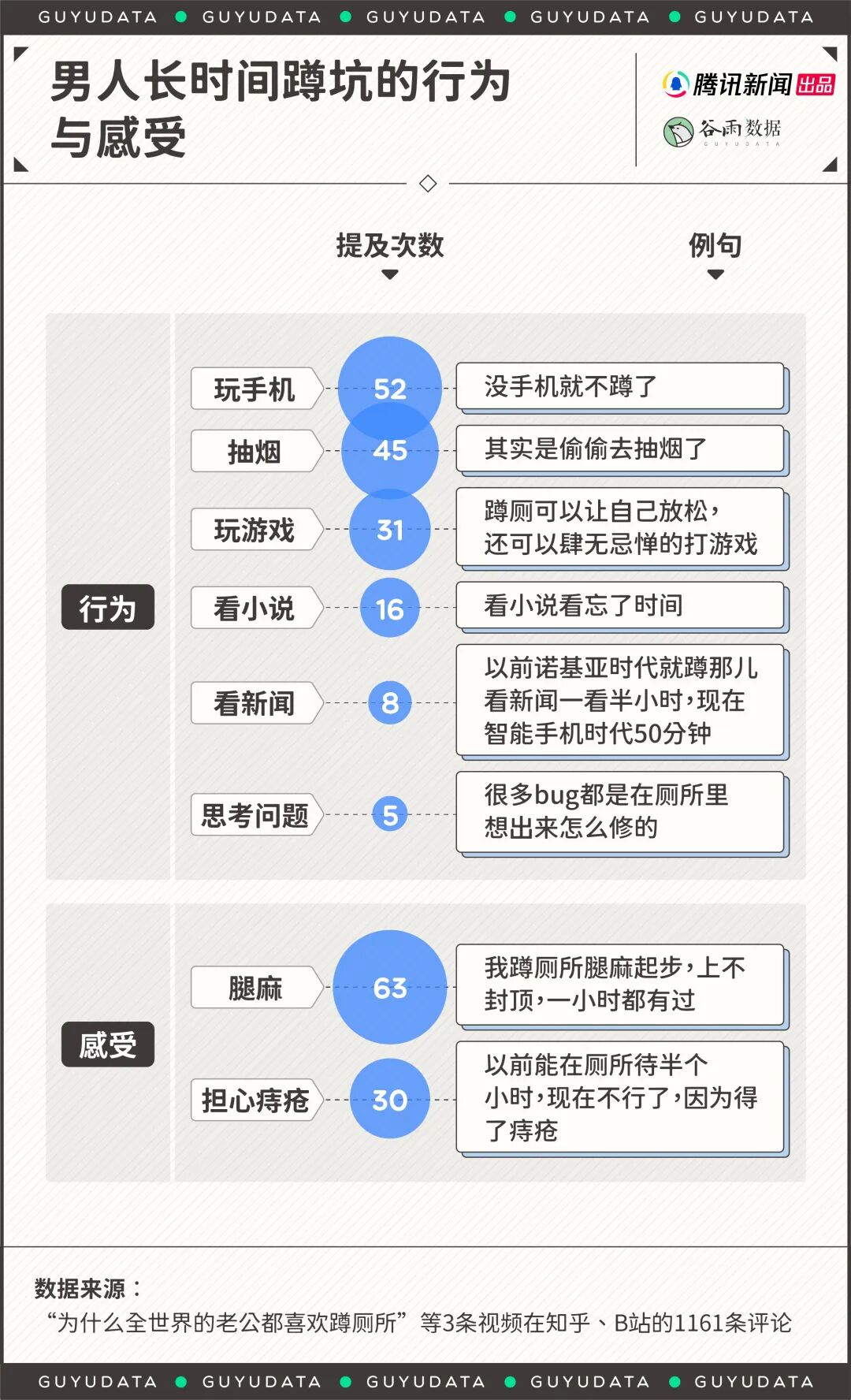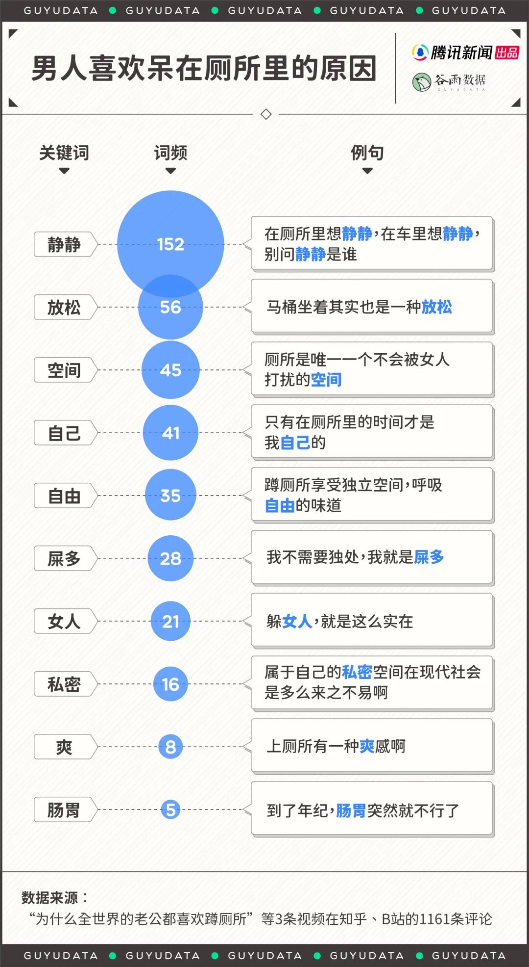 2015年的论文《我国居民肛肠疾病患病状况调查》显示,在被调查的68906人中,男性肛肠疾病患病率为50.04%,超过一半。《中国成人常见肛肠疾病流行病学调查》显示,排便时间在5分钟以内的人群肛肠疾病患病率最低,而肛肠疾病最主要的体现就是痔疮。排便时间在30分钟以上的人群患病率高达68.52%。关于乐意长时间待在厕所的原因,男性网友们在“为什么全世界的老公都喜欢蹲厕所”等视频下留下了几百条答案,总结成一句话就是:他们真的想静静。在厕所里,男人们失去的是健康的菊花,但收获的却是宝贵的自由。即便有人提出需求,一句“我在拉屎”就足够搪塞,毕竟世界上还有什么比拉屎更重要和紧急的事呢?他们只是安安静静地蹲在那里,把麻烦抛给别人,把快乐留给自己。承认吧,厕所就是男性的洞穴,是最后的避风港。或坐或蹲,享受的都是独立空间,呼吸的都是自由的空气。这里私密、温馨、舒缓压力,只有在厕所里,男人才可以真正做自己。“以前老是被问为什么蹲那么久,自己都没发现,原来需要一个独处的空间去排解自己的情绪。”“我永远觉得只有在厕所的时间是属于自己的,剩下时间全是属于别人的”。“已婚男人没便都可以随时产出,是为了在厕所满足情绪价值;未婚男人有便都可以憋住,是为了在电脑前满足情绪价值。”成年人的世界过于纷扰,在厕所里,人们可以找到逃避现实的理由。这理由可以应付别人,更重要的是,也可以应付自己。每个人都需要这样一个空间,无论男女。它可能在电动车的头盔里,或者停车场的车里,更多时候真的就在厕所里。生活已经这么累了,谁不想蹲厕所喘口气儿呢?(来源:腾讯新闻)4.https://www.vice.com/en/article/93wjwd/why-do-men-take-so-long-on-the-toilet5.https://onepointpartitions.com/blog/2017/04/19/women-vs-men-bathroom-habits-2/6.https://www.bankmycell.com/blog/cell-phone-usage-in-toilet-surveyhttps://pebblegrey.co.uk/blog/the-great-escape
