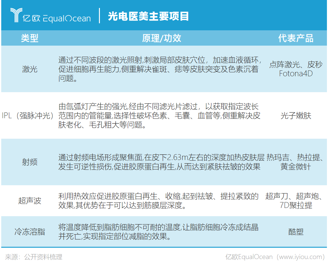 以原理划分,光电类医美市场共分为激光类、射频类与超声类三大类。“我们可以将人体的皮肤理解成一座房子,屋顶是表皮层,依次往下是真皮层、皮下组织,地基是筋膜层。”医美行业资深人士万晨介绍道,激光往往作用于表皮和真皮层,大多解决祛痘、祛斑、美白、脱毛等问题,射频类及超声类够作用到皮下组织,具有提拉、紧致功效。