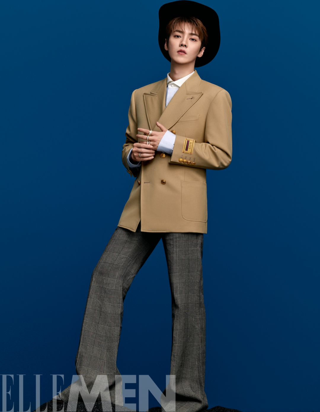 饰Gucci标识驼色夹克、浅蓝色衬衫和黑色牛仔帽 均为Gucci