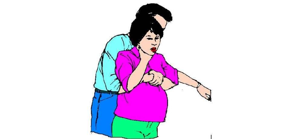 可采用上述用于成人的方法中4个步骤的后3个步骤,或稍稍弯下腰去,靠在一固定的水平物体上,以物体边缘压迫上腹部,快速向上冲击。重复之,直到异物排出。