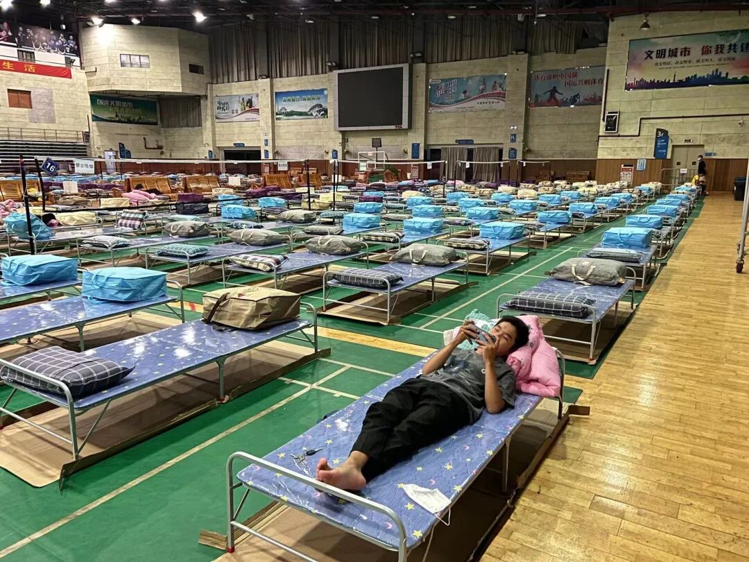 2022年11月13日晚上十点许,一位快递员躺在临时安置点的床铺上刷手机。(南方周末记者 翁洹/图)在广州市海珠区派送物资,忙活了一整天的快递员陈先生,在海珠区的快递员临时安置点洗完热水澡后,安心地躺下了。快递员、外卖骑手是当前疫情防控之下保供应的重要保障力量,但是他们当中有一部分人面临着住处被封控或者从别的地方过来滞留在海珠区暂时无法离开等难题。2022年11月12日晚,海珠区科工商信局在海珠区全民健身中心设置的快递员临时安置点正式启用,为快递员们提供了一个免费、安心的落脚点。临时安置点为快递员们配置齐了毛巾牙刷等洗漱用品。(南方周末记者 翁洹/图)临时安置点的375张床摆得整整齐齐。(南方周末记者 翁洹/图)11月13日晚,南方周末记者走访了位于海珠区仲恺路628号的临时安置点。安置点设置在全民健身中心三楼的羽毛球馆,目前设置了375张折叠床,根据需要最多可以满足900位快递员的住宿需求。床上摆放着全新的被子和枕头,每位入住的快递员还能免费领取包括毛巾牙刷、沐浴露洗发水和拖鞋等物资在内的生活用品礼包,甚至还有防蚊水。这里设有洗手间和冲凉房,还有饮用水、免费充电宝等提供,中心周边也有电动自行车集中充电桩,可以满足快递员们的车辆充电停放需求。2022年11月13日晚上十点许,快递员们在临时安置点休息。(南方周末记者 翁洹/图)陈先生向南方周末记者表示,10月底他居住的地方被封控了,如果回家去就出不来,所以他决定继续在外面进行肉菜水果等物资派送工作。他说在外面住旅馆一天的费用得要一百多元,时间长了开销也不小,而且有些旅馆也被征用为隔离酒店,停止对外营业。现在区里提供这样一个临时安置点,可以不用为住宿问题发愁。一位骑手忙完回到临时安置点,整理被子准备休息。(南方周末记者 翁洹/图)晚上十时许,陆续有快递小哥前来入住。据海珠区全民健身中心物业服务负责人介绍,这一晚,临时安置点住进了三十多名快递小哥。负责海珠区全民健身中心物业服务的工作人员在整理为即将入住的快递员和外卖小哥准备的物资。(南方周末记者 翁洹/图)另一位外卖小哥黄先生所居住的地方11月6日被列入封控区,他说:“快过年了,不想躺平,还是想多赚点钱,这几天回不了家都在站点里打地铺,现在海珠区给我们快递员安排了免费住宿的地方,可以遮风避雨,很感谢。”一位快递小哥正在办理入住手续。(南方周末记者 翁洹/图)按照海珠区的要求,快递员必须向自己所在的平台报名,按照各个站点负责人提供的名单实行名单制入场。物业服务负责人表示,临时安置点是24小时开放的,快递员每次入场必须出示穗康码,提供24小时核酸证明,而且每天早上离开前需要做一次抗原自测。物业会加大对健身中心的卫生消杀工作力度,每天做好六个时段的消杀工作,以确保为快递员们提供安全卫生的住宿环境。工作人员向快递小哥介绍临时安置点的设施位置。(南方周末记者 翁洹/图)猜你想看