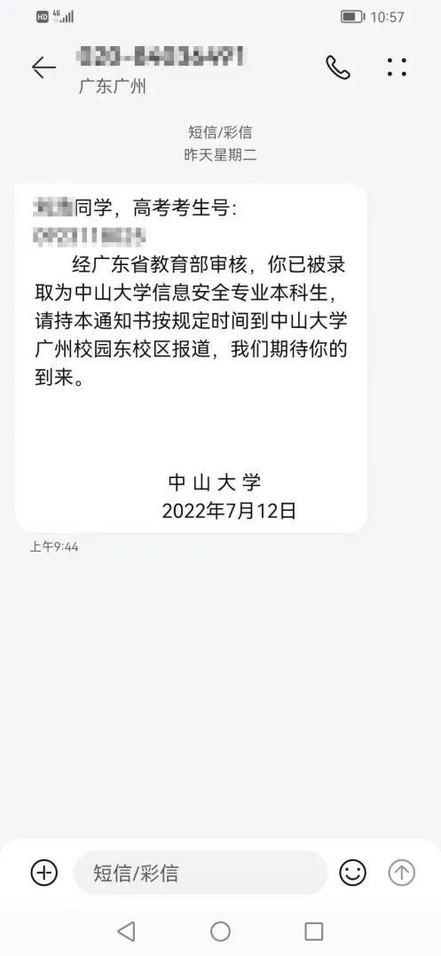 在“外省480分捡漏中山大学”文章刷屏的同时,也有考生收到一则“录取短信”。短信中有自己的名字及考号,并称“经广东省教育部审核,你已被录取为中山大学信息安全专业本科生”。落款内容为“中山大学”“7月12日”。