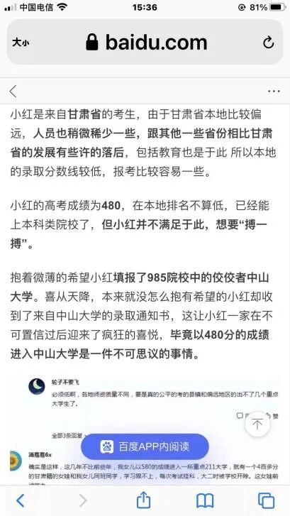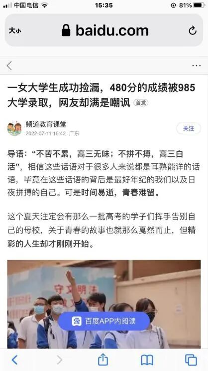 近几天,一篇标题名为《一女生成功捡漏,480分的成绩被985大学录取,网友却满是嘲讽》的文章在网络热传。文中称,甘肃一名考生因志愿填报得当,以480分的成绩捡漏985高校中山大学,被评为“低分高录”的幸运儿。
