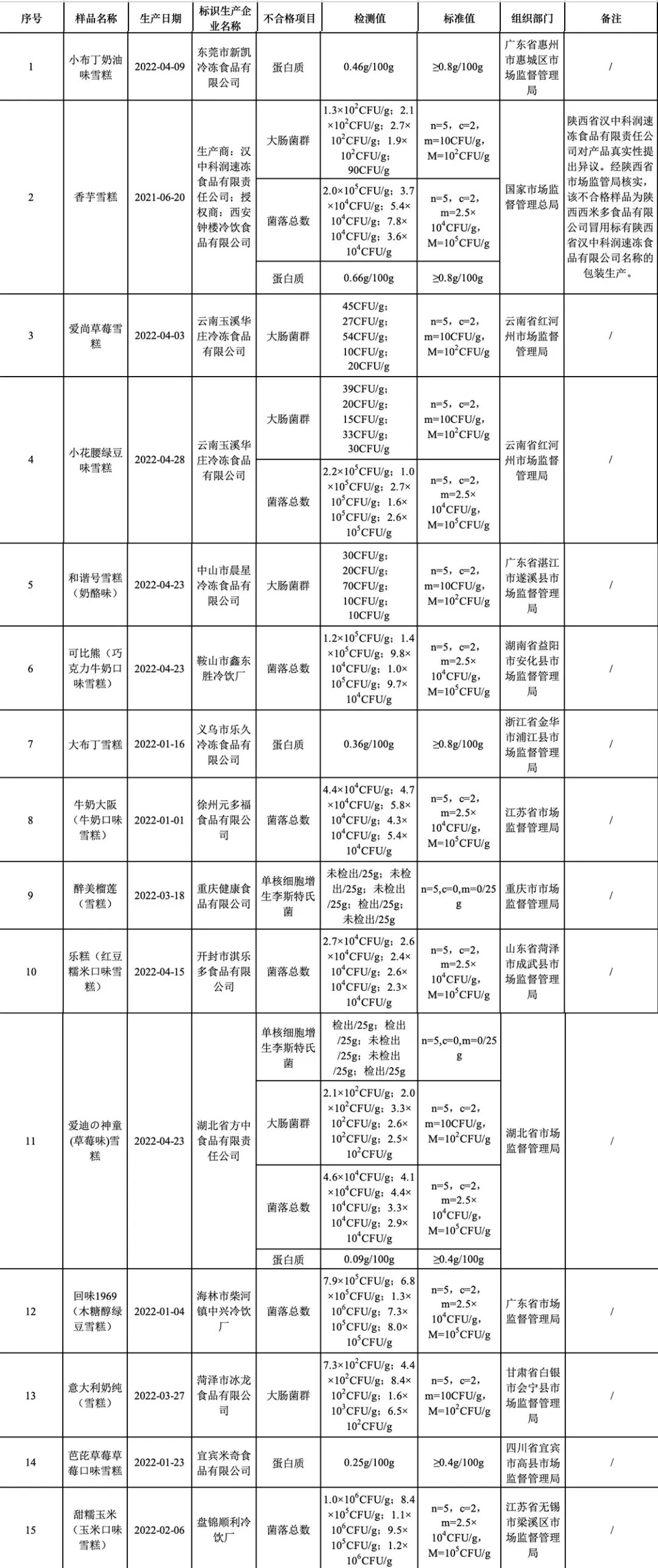 这15批次雪糕样品因抽检不合格
