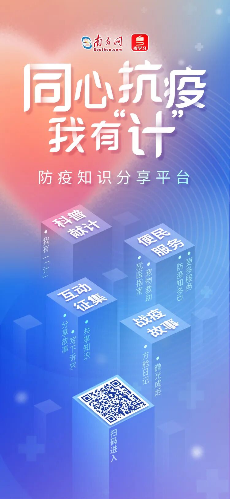 1.每天佩戴口罩、保持社交距离、注重个人清洁卫生等个人防护措施,是阻断新冠疫情传播的关键手段。而口罩,就是预防呼吸道传染病的重要防线,可以降低新型冠状病毒感染风险。科学戴口罩,这几点你都做对了吗?2.控制传染源、切断传播途径和保护易感人群,是预防传染病的三大方面。消毒则是切断传播途径的重要方式之一。家庭科学消毒,你做对了吗?3.防控政策优化调整之后,广州市民陆续恢复了出行的节奏。广大群众的日常出行都离不开地铁、公交、出租车等公共交通工具,但公共交通一般人员密集,疫情期间,尤其要做好个人防护,让自己安心、身边人放心。疫情期间,乘坐公共交通有哪些防护要点?4.疫情期间,大家在外出采购、收取快递、领取外卖时,如何保证清洁安全成为防疫的重要一环。这份疫情期间安全采购指南请收好!5.其实,在不同的场合中,我们可以采取有针对性的防护措施,更好地防范病毒。身处不同场合,如何做好个人健康管理?6.目前,居家医学观察仍是抗疫的重要措施,能对暴露后感染风险较高人群进行医学健康管理。居家医学观察怎么做?居家隔离人员需要注意什么?7.疫情整体情况逐步向好,但防护仍然不能放松。日常居家期间,也不能忘记做好个人防护。疫情居家如何做好个人防护?这份指南帮到你。8.目前方舱医院里越来越多的患者康复出舱。出舱返家有哪些注意事项?9.日前,国务院应对新型冠状病毒肺炎疫情联防联控机制综合组研究制定了《加强老年人新冠病毒疫苗接种工作方案》,加快推进老年人新冠病毒疫苗接种工作,保障人民群众生命安全和身体健康。老年人接种新冠疫苗有哪些注意事项?10.新冠病毒疫苗的作用一方面可以预防感染,阻断流行,另一方面,还也可以预防重症、减少死亡的发生。如今,疫苗的接种方式也有了新的选择。全球有多家公司正在研究开发吸入用重组新冠病毒疫苗,北京、上海、广州、杭州等地陆续开始预约吸入式新冠疫苗。什么人能接种吸入式新冠疫苗?同心抗疫我有“计”——防疫知识分享平台自11月11日上线以来,获得了广大网友的关注,不少网友在平台上与我们共享了实用的防疫知识,涵盖个人健康管理、场所防护、疫苗接种等方面,目前已吸引了120多万网友点击浏览。如果你有防疫科普与应对措施分享,也欢迎你为平台献上宝贵一“计”。
