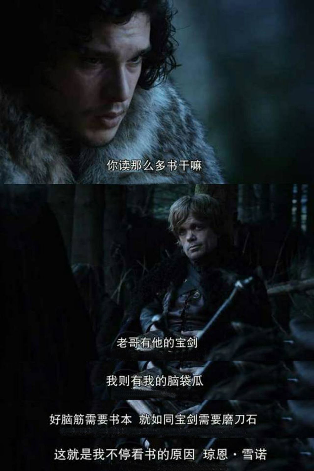 他说,我以为守夜人能让你历练成男人,至少有点男人样,但你还是那么软弱、肥胖,只知道埋头读书,终其一生,读着那些比你强的人的成就。