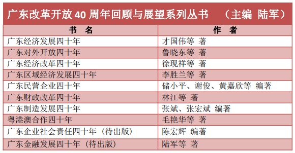 自2017年初,岭南学院计划组织国内外专家学者编写“广东改革开放40周年回顾与展望”丛书,从经济发展、经济改革、对外开放、区域经济发展、民营企业、广东制造、财政改革、金融发展、企业社会责任以及粤港澳合作等视角全方位回顾广东的发展历程,总结广东的发展经验,并展望未来的发展方向。