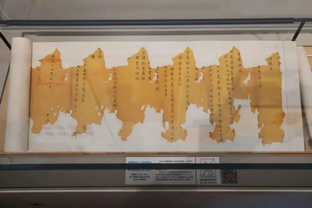 “缘岸梵刹”万寿寺历史沿革展在展示万寿寺历史的基础上,增加了近五年万寿寺修缮、考古发掘过程中新发现的文物。其中,一件留有火焚痕迹、文字残缺不全的疏文尤为珍贵,这是康熙五十七年(1718年)孝惠章皇后入葬清东陵后,在万寿寺举办法事活动的祭文,为康熙第五子恒亲王所写。