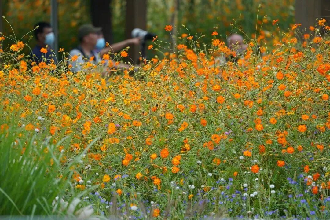 公园樱花园及樱珞花谷景区内共6000平方米的硫华菊和百日草已进入盛花期。金黄的硫华菊与姹紫嫣红的百日草交错排列,层层叠叠,光芒绽放。放眼望去,犹如徜徉在金色的花海中。阵阵微风拂过,花朵错落,随风轻摆,灵动曼妙,惹人心醉。花丛间不时还有蜂蝶蹁跹,烂漫可爱,呈现出都市里悠然的田园风光。