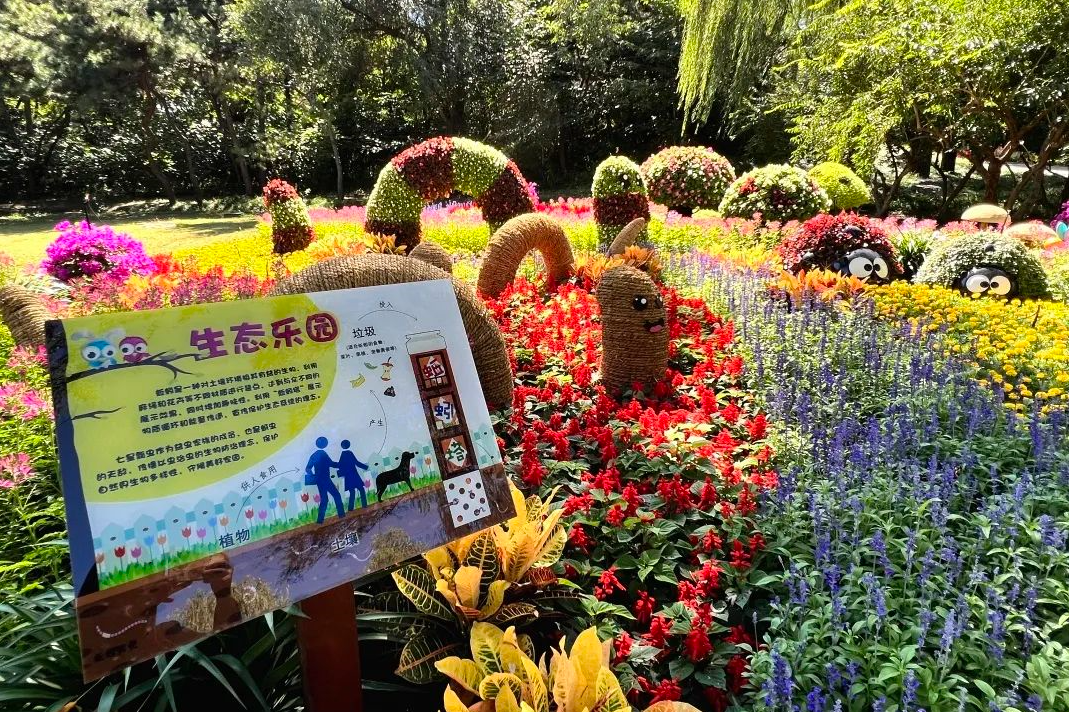 公园樱花小西门“生态乐园”主题花坛首次以花坛的形式向游客传播生物多样性科普知识。花卉绿植和环保废旧材料的巧妙搭配,既生动又富有趣味性。3个“蚯蚓塔”和2只呆萌的“七星瓢虫”展示出物质循环和能量传递,宣传保护生态系统的理念,传播以虫治虫的生物防治理念,保护自然界生物多样性,守候美好家园。