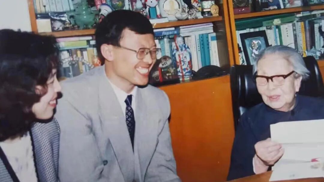▲1995年,《海淀报》举办了“写理想,画追求”作文、绘画大赛活动,特邀冰心先生做顾问。图为副总编卫汉青(左二)、记者眭华(左一)与冰心先生(右一)合影