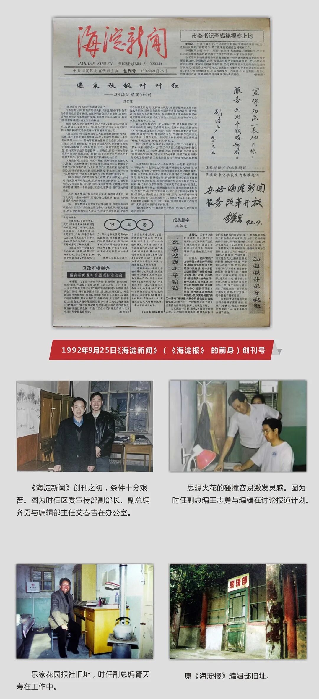 “‘艰苦创业 开拓创新’是《海淀报》创刊伊始的宗旨,直至今日也是我们的座右铭,不忘初心、牢记使命,从纸开端、走向融合。”海淀区融媒体中心策展相关负责人介绍说。展览目前在海淀区政府第二办公区一层大厅持续展出。