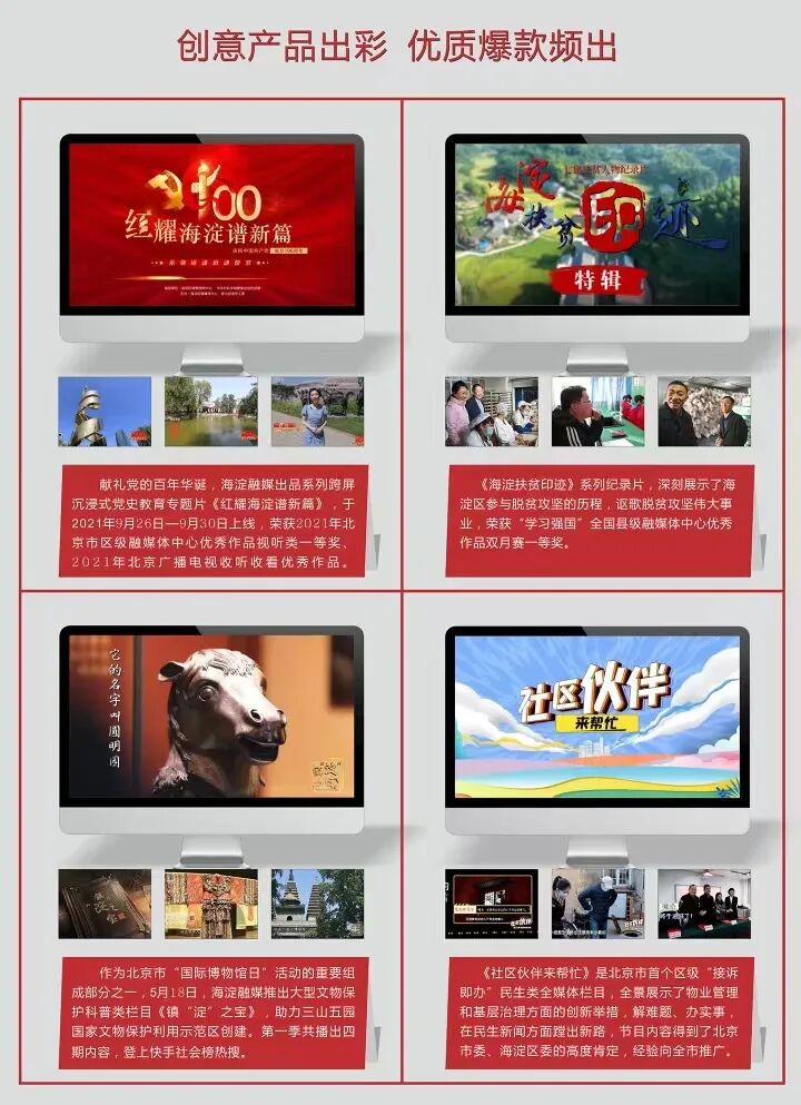在内容创新方面,海淀融媒制作推出了首档驻区企业专题栏目《科创中心“核”动力》、首季大型文物保护科普类栏目《镇“淀”之宝》、北京市首个区级“接诉即办”民生类全媒体栏目《社区伙伴来帮忙》等出彩的创意产品、优质爆款作品,并通过IP运营持续赋能,策划执行了“两岸青年峰会”,推出“才聚云端”大型网络招聘、组织开展“我在海淀过大年”系列活动,持续探索发展新路径。