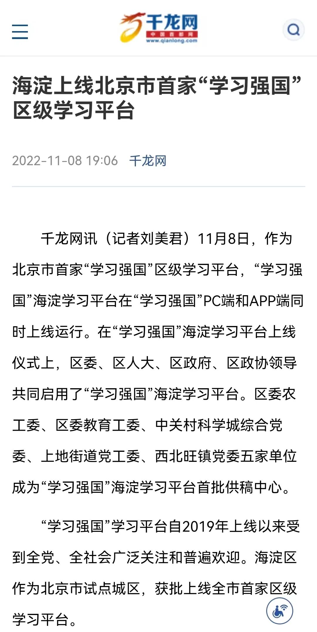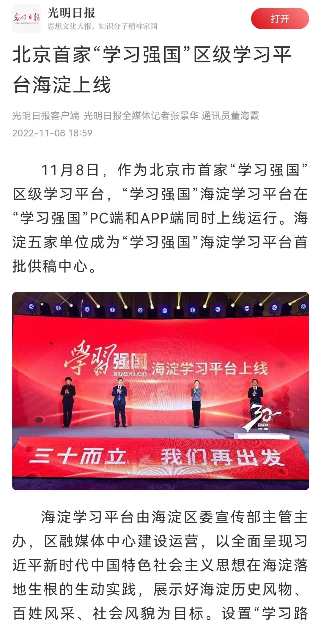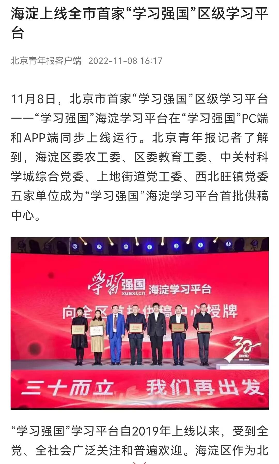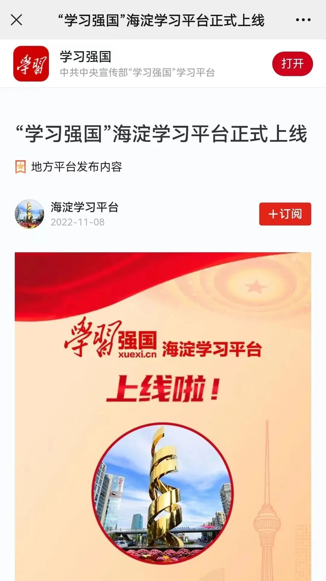 “学习强国”学习平台自2019年上线以来受到全党、全社会广泛关注和普遍欢迎。海淀区作为北京市试点城区,在中央和市委的关心下,获批上线全市首家区级学习平台。