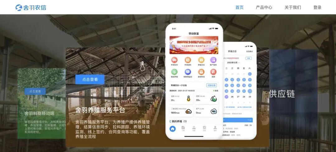 舍羽科技位于海淀区温泉镇,成立于2018年,是一家农业养殖产地供应链数字交易服务商,以自研家禽农业产业互联网云软件系统切入万亿规模的农业养殖产地市场,为家禽产地端上下游提供数字化交易服务和自营生鲜供应链。在公司研发的“舍羽农信App”上,申请养殖合同、申请采购饲料、记录死淘日记、兽药使用记录、环控监测、出栏申请等都可在线数字化完成。
