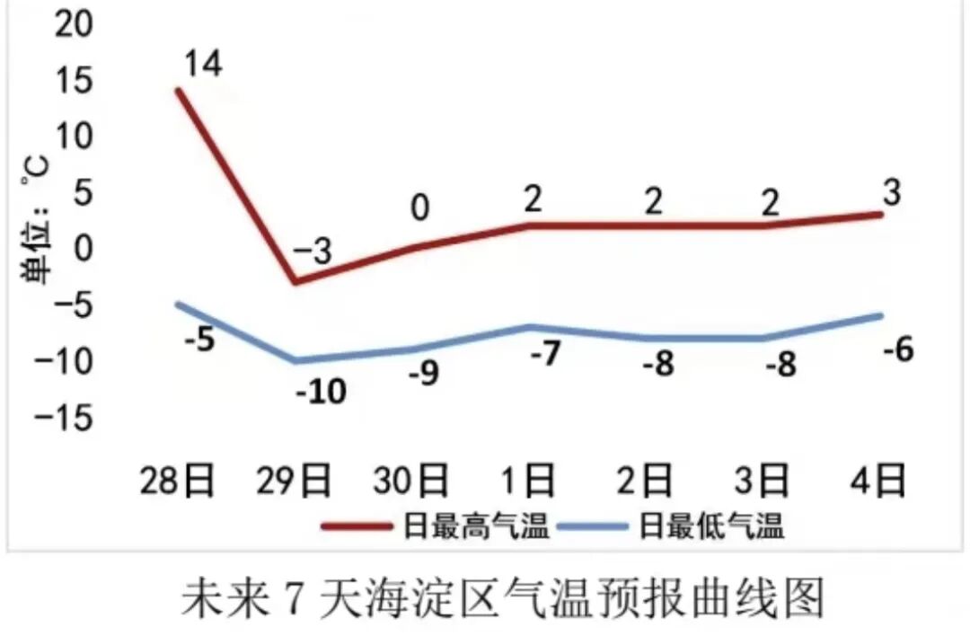 强降温:未来一周气温持续低迷,28日夜间至30日我区气温将明显下降,最高气温将由28日的14℃降至29日的-3℃,降幅可达17℃;最低气温将由28日早晨的-1℃降至30日早晨的-10℃,降幅可达9℃。本次冷空气过程最低气温将出现在30日早晨,为-10℃,可能跌破近十年同期最低值(近十年11月下旬海淀国家站极端最低气温为-9.7℃,出现在2015年11月26日)。