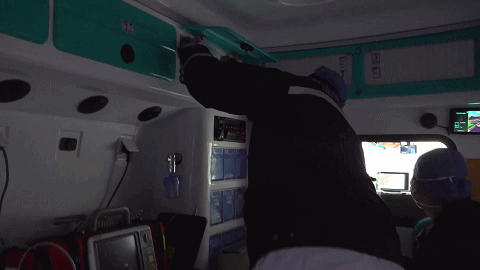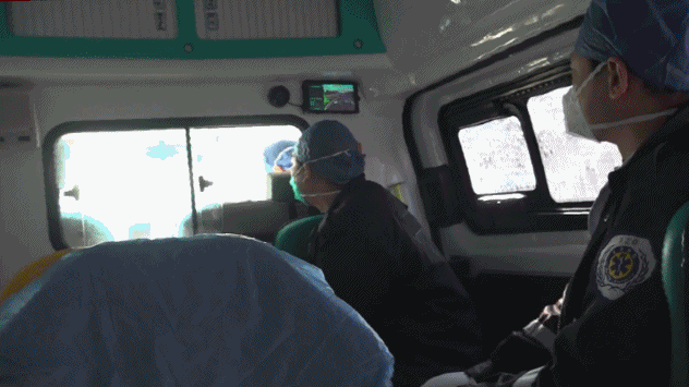 路上,护士张从博告诉记者,医护人员目前每12小时轮一班,一边说着,张从博一边迅速且有条不紊地准备急救用品。