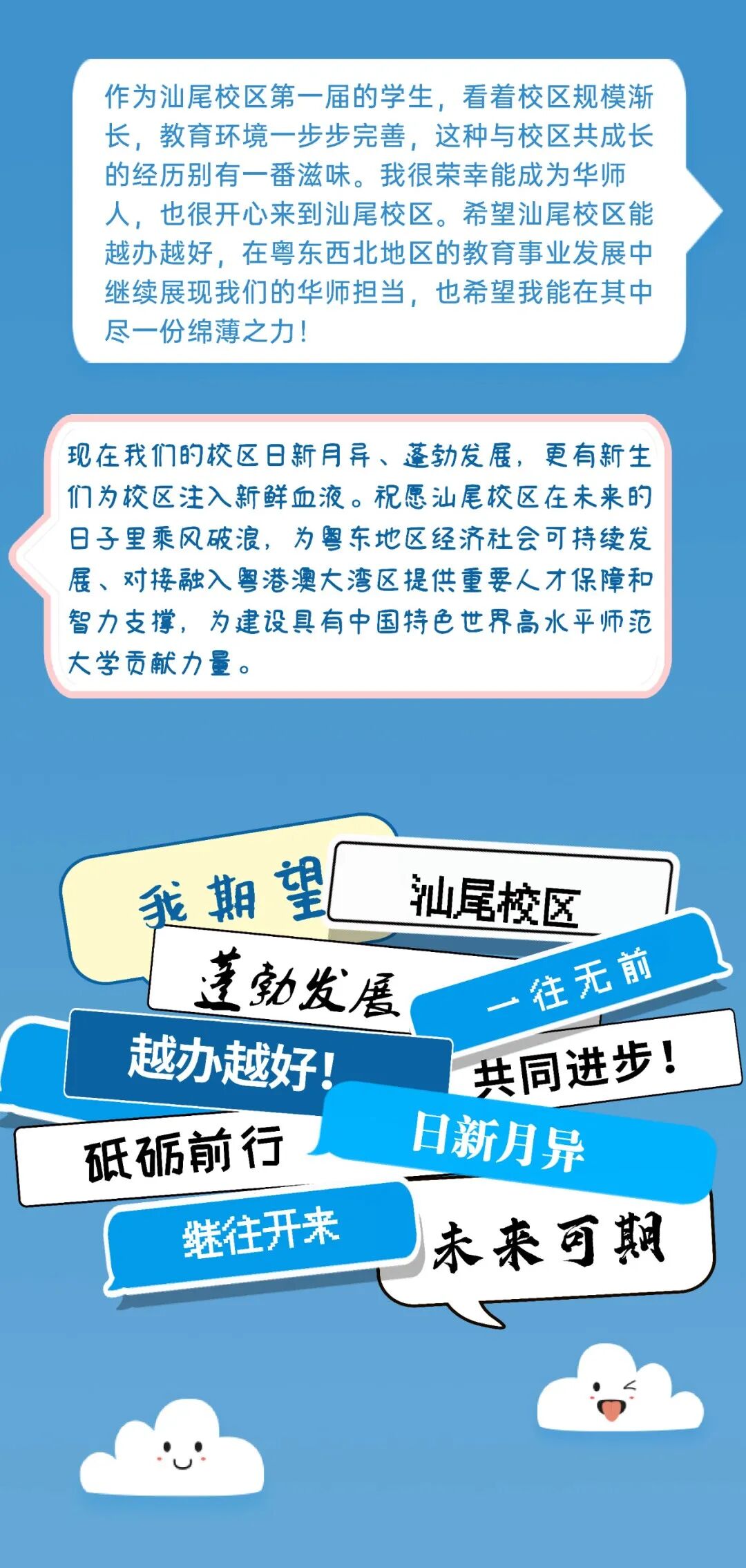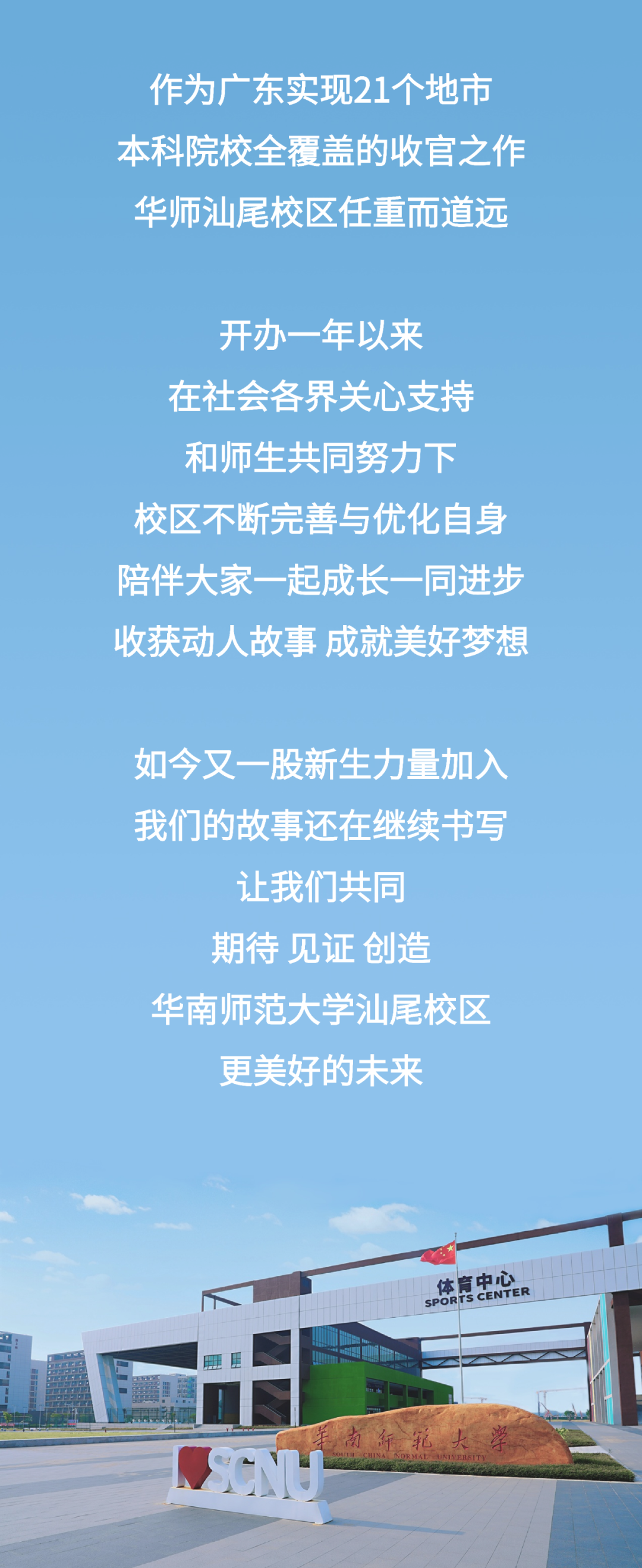 习近平总书记告诉我们,幸福美好生活不是从天上掉下来的,而是要靠艰苦奋斗来创造。汕尾校区仍在建设之中,部分场所设施和配套条件还在持续完善,可以相信,在共建四方和全校师生的协同努力,关心帮助下,在校区全体教职员工和同学的共同努力下,汕尾校区的未来一定会更加美好!