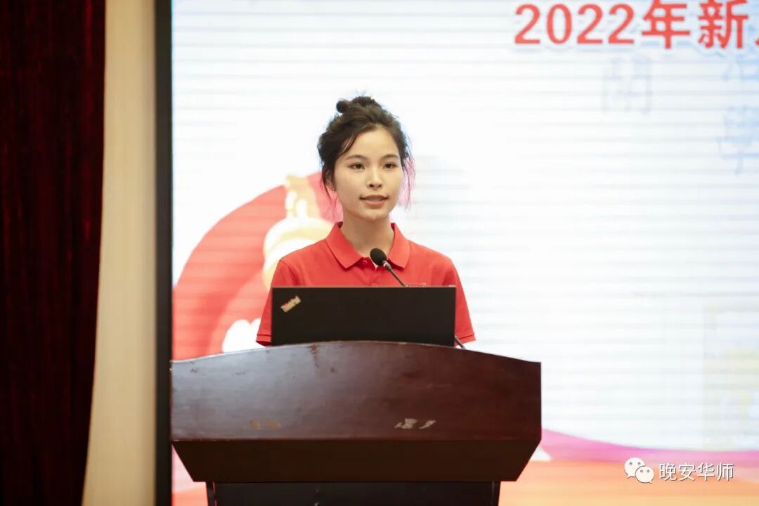 入职华师,在金檀眼里更像是回家。因为以往的求学经历都与“师范”或“教育”元素相关,回到“师范”这个大家庭让他倍感亲切。对于如何快速融入“华师大家庭”,他有着自己的方法与体会。他认为,作为新教师,应该做到积极投身学科团队建设、主动承担人才培养任务、逐步凝练科学研究方向。“为把华南师范大学建设成为教师教育优势突出的创新型高水平大学做出自己应有的贡献。”作为身处在教育事业一线的奋斗者、奉献者,他用陶行知先生的寄语“捧着一颗心来,不带半根草去”,与各位新教师共勉。孙书琦,毕业于北京大学,2022年9月入职华南师范大学,现任化学学院辅导员。2017年组团赴美国波士顿参加国际遗传工程机器竞赛比赛获铜奖;2020年获北京大学第二十八届“挑战杯"一等奖。从校园到校园的生活,相同的场景之下,孙书琦的身份却有了变化。入职华师,她成为了一名辅导员。“为什么来华师当辅导员?”这个问题的答案一部分来源于华师人对于“家庭新成员”的细心照顾,另一部分来源于她与学生的悉心相处。她试着与学生共情、感受学生所感。“我们辅导员、我们教师,不仅仅只是知识的传授者,更应是做人做事的言传身教者。这比教会他们知识更重要、更艰难。这也许就是习近平总书记对老师们提出的,要做‘经师’,更要做‘人师’的意义所在吧。”在两名新入职教师代表发言后,马茂军教授带领新教师进行入职宣誓。现场全体老师起立,面向国旗,举起右手,庄严宣誓。
