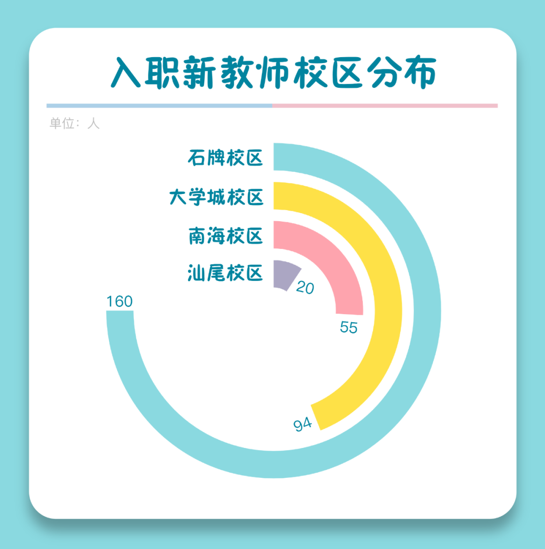 近年来,为进一步提升我校科研与教学水平,建设创新型高水平大学,学校大力引进各类人才,打造高效的行政管理和教学辅助队伍。2022年学校新聘各类教工329人,其中石牌校区160人、大学城校区94人、南海校区55人、汕尾校区20人。下面让我们具体了解近五年入职新教师数量及今年新教师的相关数据。![]()