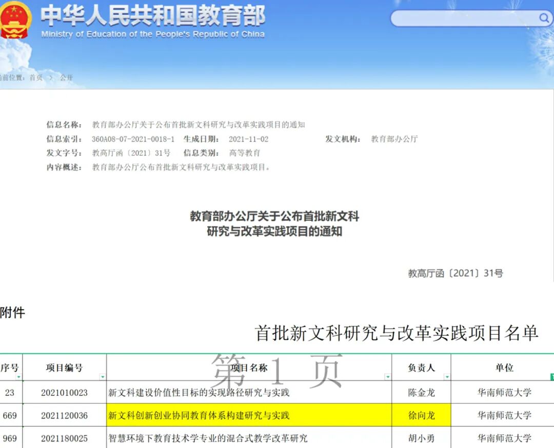 2021年,牵头申报的《新文科创新创业协同教育体系构建研究与实践》获教育部首批新文科研究与改革实践项目立项。