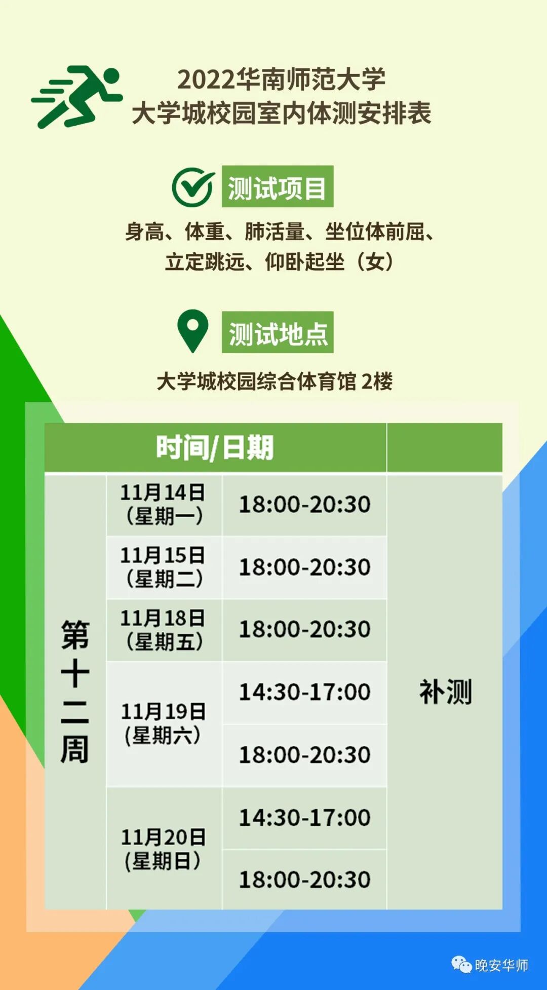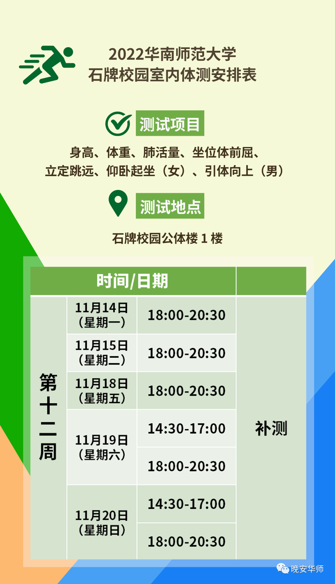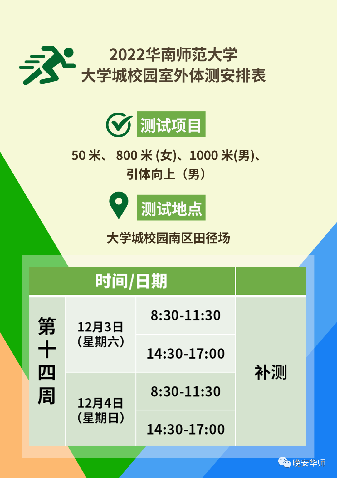 10月12日,我校发布《关于开展2022年华南师范大学学生体质健康标准测试通知》,指明今年广州校区石牌校园和大学城校园学生《国家学生体质健康标准》的测试工作将于2022年10月至12月进行,学生测试成绩将上报教育部并存入学生档案,具体安排如下。