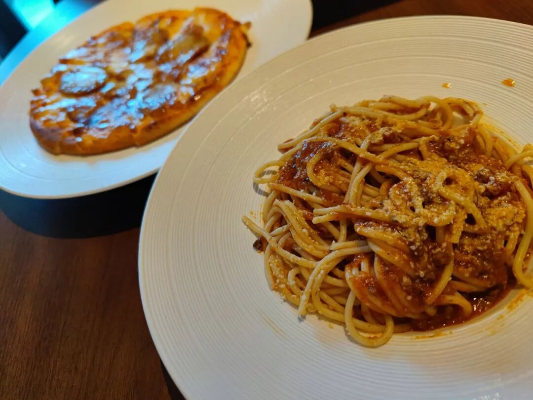 给的2张90元餐券,点了份意面和披萨,味道有点淡,不怎么好吃。