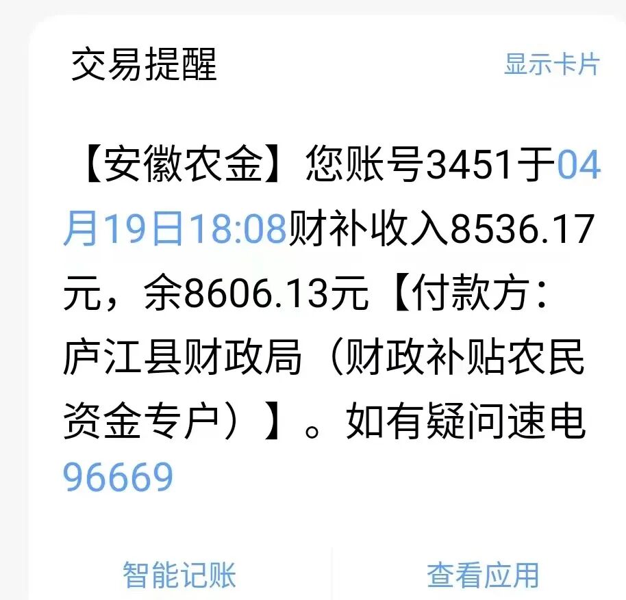“短信通知,今年的一次性补贴到账了,一共8536.17元!”朱中文说。