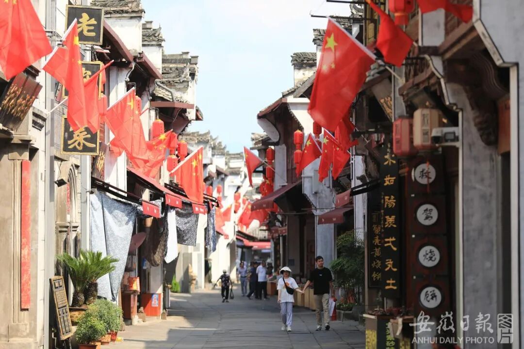 △屯溪老街悬挂起鲜艳的五星红旗。(樊成柱 摄)