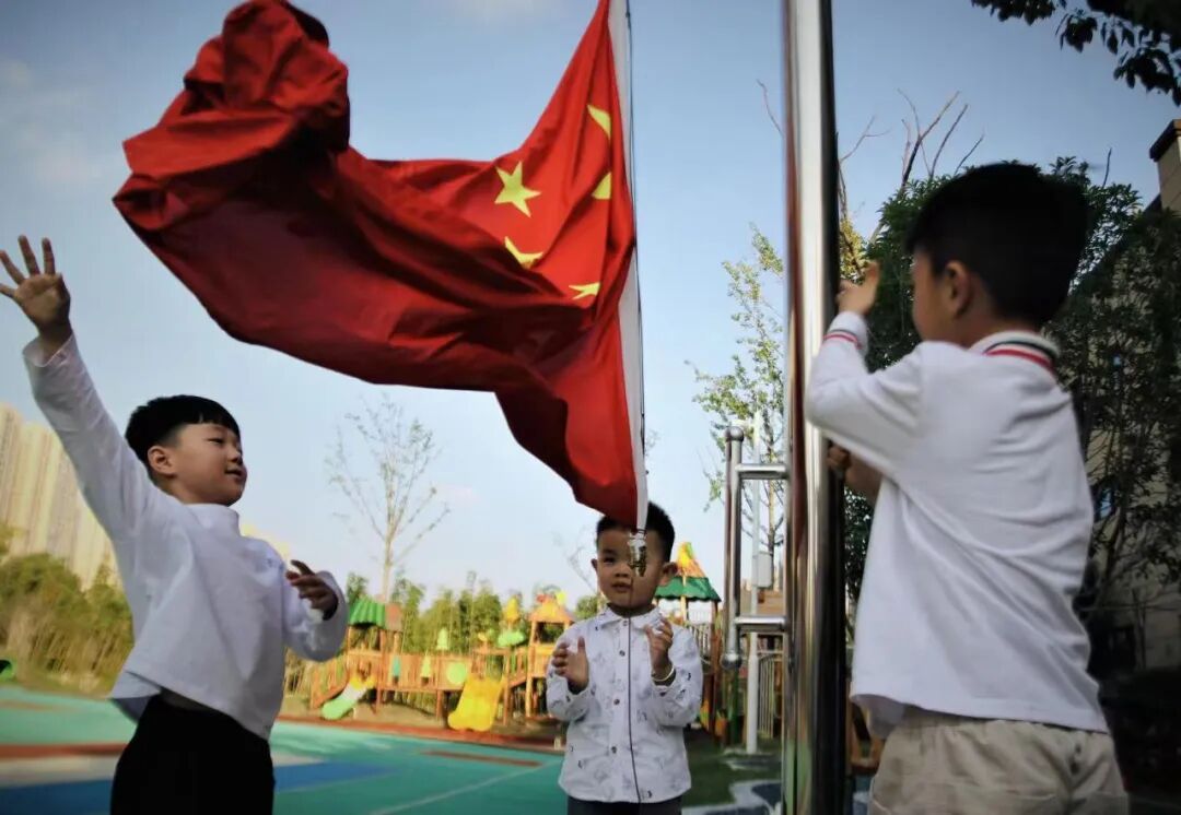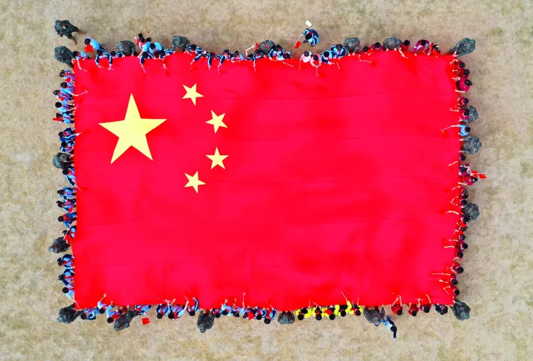 △国庆节前夕,武警合肥支队执勤一大队官兵和驻地学校百余名小学生一起托举着定制国旗欢呼合影。(徐伟 摄)