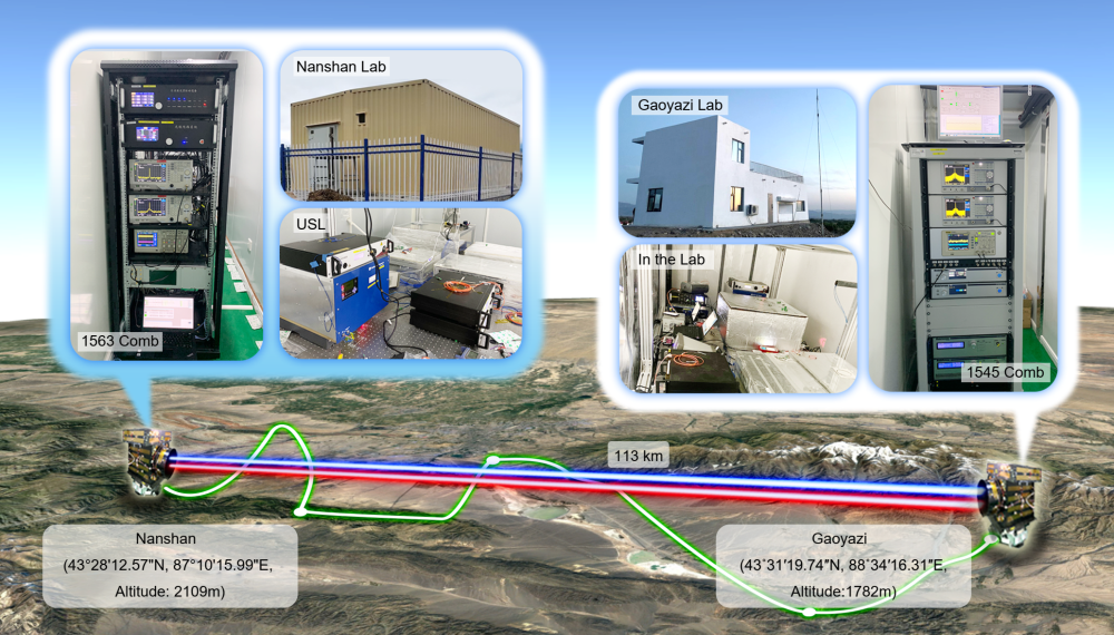 中国科学技术大学团队向这一难题发起挑战。在光源方面,研制出高功率高稳定度光梳,在光信号收发信道方面,研制出高稳定性且高效率的光收发望远镜系统,另外采用线性光学采样的干涉测量方式实现高精度的时间测量。经过一系列技术攻关,终于在相隔113公里的新疆南山天文台和高崖子天文台之间实现了万秒10的负19次方量级稳定度的时频传递。