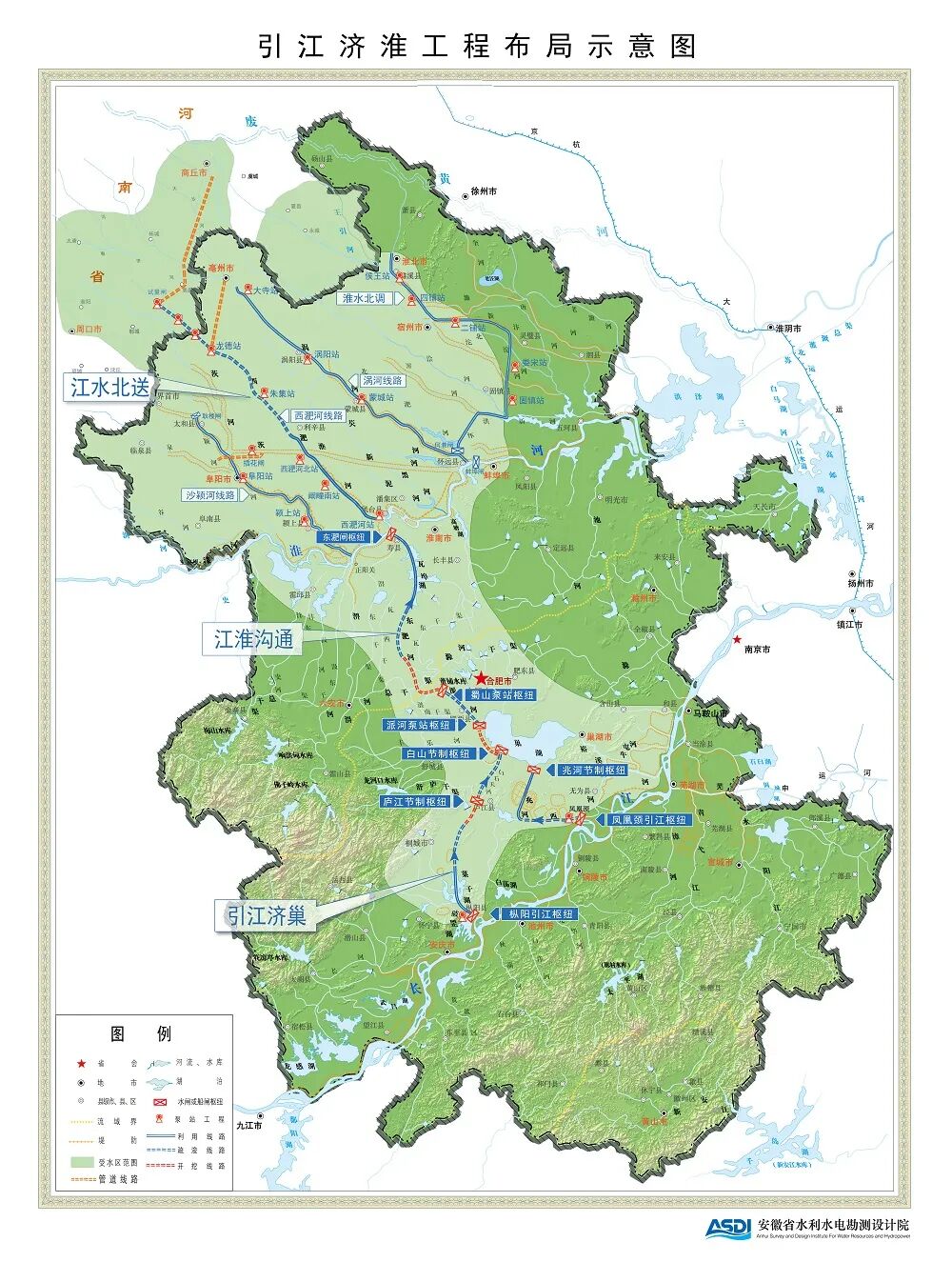 引江济淮工程分为引江济巢、江淮沟通、江水北送三段,共有八大枢纽工程,分别为枞阳引江枢纽、凤凰颈引江枢纽、兆河节制枢纽、庐江节制枢纽、白山节制枢纽、派河泵站枢纽、蜀山泵站枢纽和东淝河闸枢纽。
