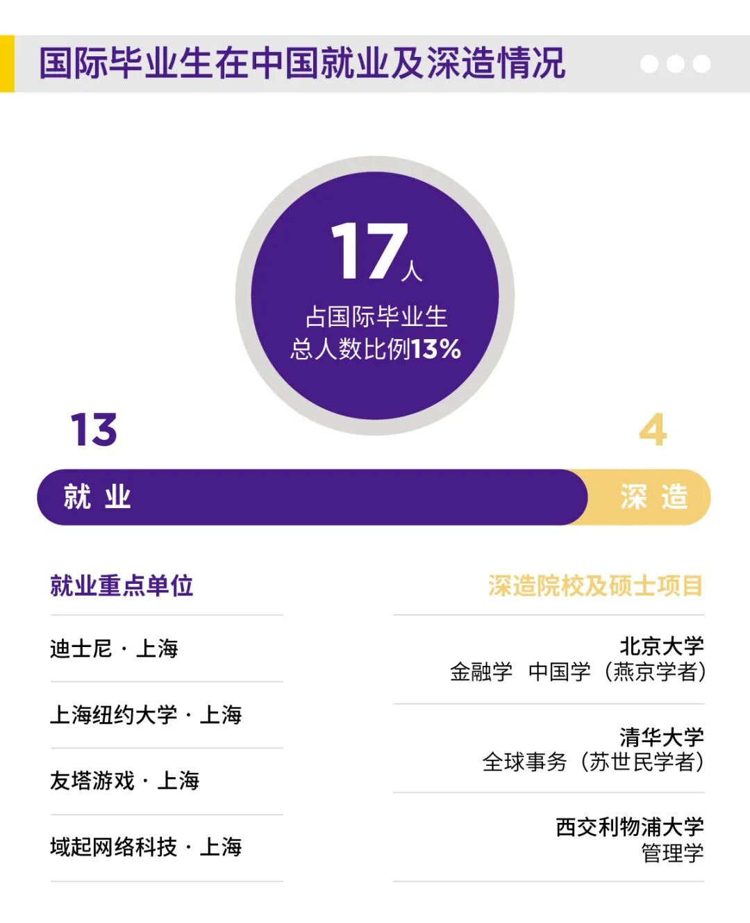 中国毕业生就业率为95%。67%选择继续深造,其中,81人前往U.S. News世界大学排名前50大学深造,占中国毕业生深造总人数的72%。深造去向包括:哈佛大学、麻省理工学院、斯坦佛大学、加利福尼亚大学伯克利分校、牛津大学、哥伦比亚大学、剑桥大学等世界知名学府。10人获得奖学金直博,占深造总人数9%。人均获得3.9份录取通知书;迈进职场的中国毕业生一如既往地受到各大名企青睐,就业领域主要覆盖:金融/会计/银行、互联网/软件/信息技术/硬件、教育/科研、管理咨询、零售/时尚/消费品等,更有毕业生践行公益理想,前往偏远山区投身创新教育。