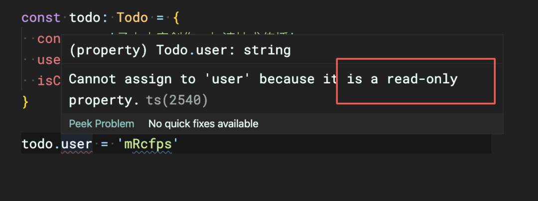 可以看到我们同样使用了 TS 的冒号语法来进行函数参数和返回值的类型定义,因为 message 一般是一个字符串 ID,所以我们给它 string 类型,而这个函数绝不会有返回值,只是单纯的抛出错误,所以我们给返回值一个 never 类型。