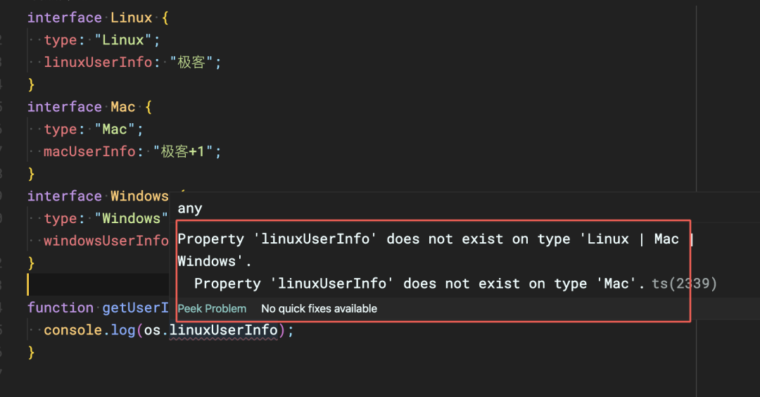 可以看到上面我们将 osType 扩充成了 os ,然后三种 os 有相同的字段 type 和不同的字段 xxxUserInfo ,但是当我们函数体类打印 os.linuxUserInfo 的时候,TS 编译器报了如下错误: