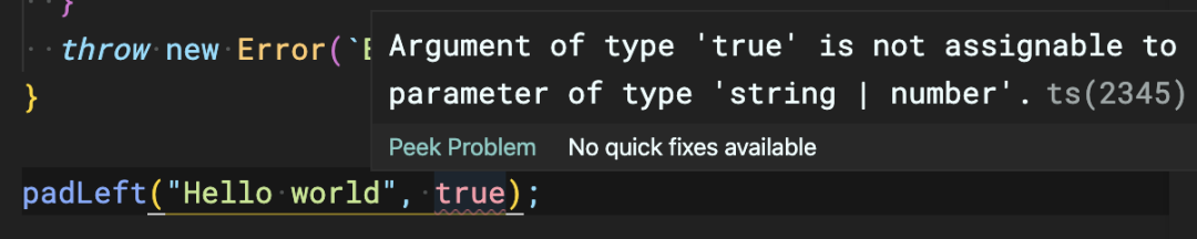 可以看到我们用冒号注解形式给 x 和 y 注解了 number 类型,而对于返回值,我们直接以 add(): number 的形式注解返回值。有时候返回值也可以不写,TS 可以根据参数类型和函数体计算返回值类型,也就是俗称的自动推断类型机制。