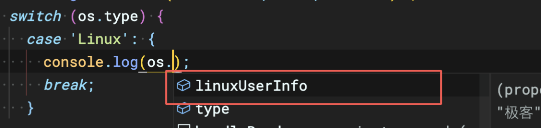 可以看到,如果有同学跟着手敲这个函数的话,会发现当针对 os.type 进行条件判断之后,在 case 语句里面,TS 自动提示了需要取值的类型,比如在 Linux case 语句里面输入 os. 会提示 linux :