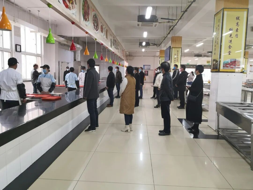 师生在食堂就餐时,间隔一米排队,并采取套餐制,减少学生聚集时间。