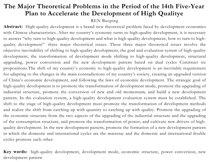 关键词:高质量发展;发展方式;经济结构;动力转换;新发展格局