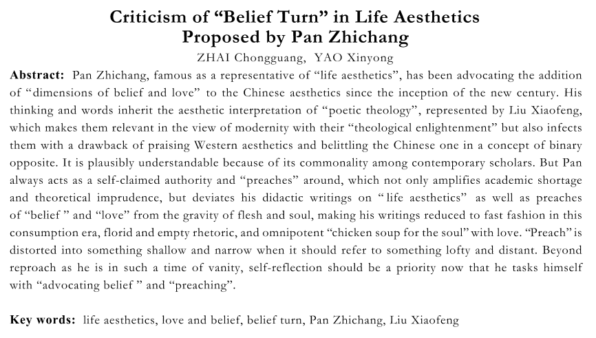 摘要:潘知常以“生命美学”的代表而著称,新世纪以来更大力提倡为中国美学补上“信仰之维、爱之维”,其思想、言说为刘小枫所代表的“诗化神学”美学诠释之延续,自有“神性启蒙”的现代性意义,也因此而同染以二元对立思维扬西贬中之弊。此实为当代学人所共有之长短,似不必苛责。但潘先生经常自诩、四处“讲道”,却放大了其知识上的欠缺和学理上的轻率,也使得他的“生命美学”“信仰”和“爱”,远离了肉身与灵魂的沉重,成为消费时代的时尚,浮华为空洞美丽的辞藻、无所不能的爱之“心灵鸡汤”。“布道”所指高远,结果却失之浅近,虽有浮华时代之因,但既以“信仰”与“宣道”为己任,恐首先当自省。