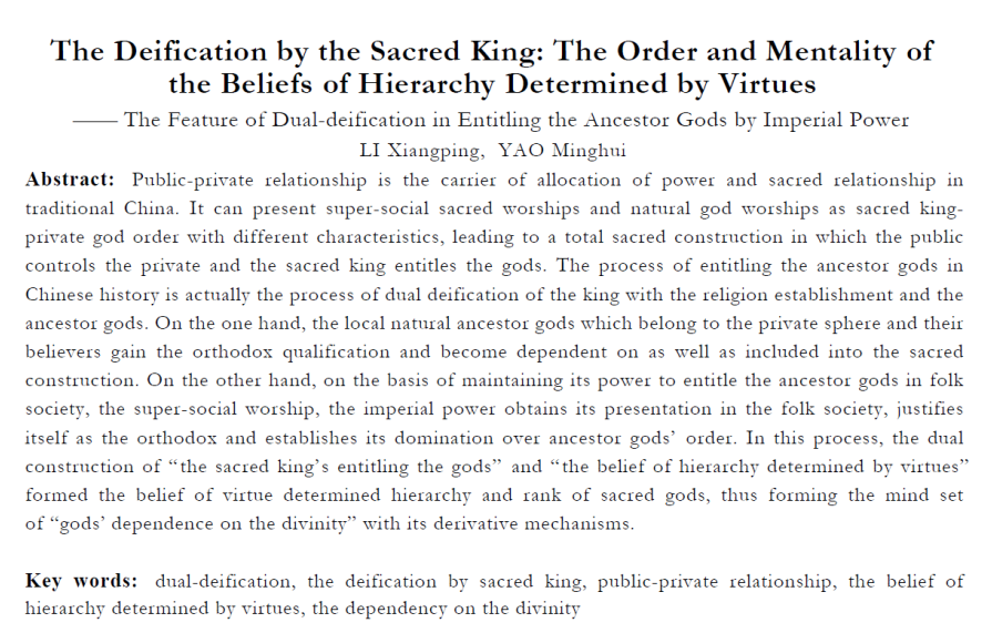 摘要:”公私关系是传统中国配置权力与神圣关系的载体,它能把超社会圣明崇拜与自然神灵崇拜直接呈现为不同属性的王圣 —私神格局,最终形成以公控私进而以圣化神的总体圣神秩序。中国历史上王权敕封祠神的过程,实际上就是王公圣教与民间祠神的双重神圣化。一方面是处于私领域、自然崇拜的祠神及其信奉者凭借官方认可而纳入 “王公 ”圣教秩序中而获得正统资格,依附于整体圣神结构;另一方面是超社会崇拜的王权基于民间神祇资格的把控,在庶民社会中实现自身的显现与证成而建成祠神秩序。在此过程中, “以圣化神 ”和“德位信仰 ”的双重建构,形成王公教化掌控民私祠神的德位信仰、圣神等级,最终建构了 “神圣依附”的心态秩序及其衍生机制。