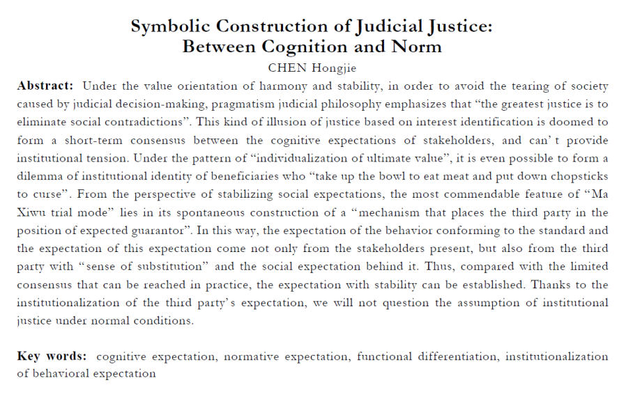 摘要:在以和谐与稳定为主的社会环境下,实用主义司法哲学强调的是一种结果导向的利益衡量方法。这种基于利益认同而塑造的公正幻象注定只能在利益相关方的认知期望之间形成短暂的共识,无法提供制度化的张力。在 “终极价值个人化 ”的格局下,甚至还有可能形成获益者 “端起碗来吃肉,放下筷子骂娘 ”的制度认同困境。从稳定社会期望的角度来看, “马锡五审判方式 ”最可称道之处在于其自发地建构出一种 “把第三方置于期望担保人位置的机制 ”。这样一来,对符合规范之行为的期望,以及对这一期望的期望就不仅仅来自在场的利益相关人,而且也来自与实际争议利益无涉但是却有 “代入感 ”的第三方及其背后象征的社会期望。由此,与实际上能够达成的有限共识相比,具有稳定性的期望得以建立。得益于第三方期望的制度化,在正常情况下我们就不会对制度公正的假定产生质疑。