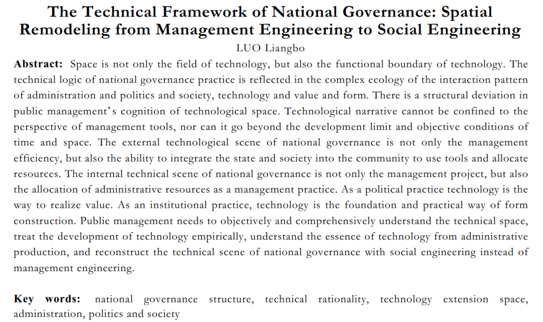 摘要:空间既是技术的作用场域,也是技术的功能边界。国家治理实践的技术逻辑是在行政与政治和社会,技术与价值和形式交互格局的复合生态中体现的。公共管理对技术空间的认知存在结构性偏差,技术叙事既不能拘囿于管理工具的视野,也不能超越了时空的发展限度和客观条件。国家治理的外部技术场景不止于管理效能,也体现为将国家和社会整合为共同体的工具运用和资源配置能力。国家治理的内部技术场景不止于管理工程,作为管理实践也体现为行政资源的配置方式,作为政治实践是价值实现的途径,作为制度实践是形式的建构基础和实践途径。公共管理需要客观全面认知技术空间,实证看待技术的发展,从行政生产理解技术的本质,以社会工程替代管理工程重塑国家治理的技术场景。