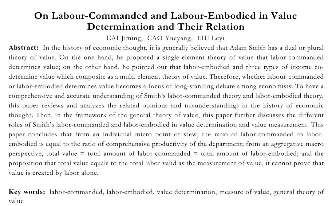 关键词:耗费的劳动;购买的劳动;价值决定;价值尺度;广义价值论