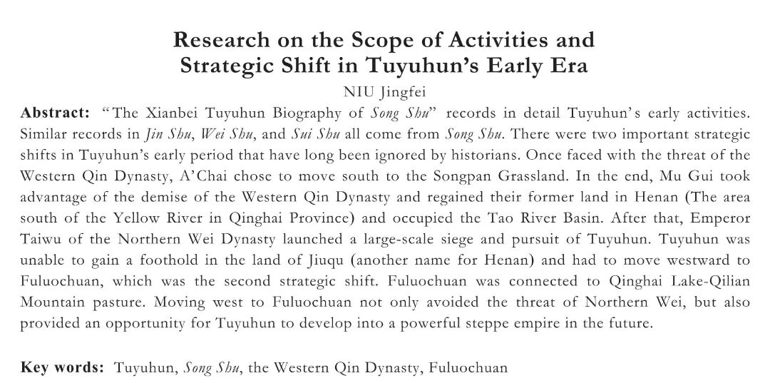 摘要:《宋书·鲜卑吐谷浑传》详细记录了吐谷浑早期的活动范围,《晋书》《魏书》《隋书》等相关记录多来自《宋书》。吐谷浑早期有两次重要却长期被史家所忽视的战略转移。一次是面临西秦威胁,阿豺选择了南下松潘草原,最终慕璝趁西秦灭亡收复了河南故地并占据了洮河流域。此后北魏太武帝对吐谷浑展开大规模围攻、追击,吐谷浑无法在九曲之地立足,只得西迁伏罗川,此为第二次战略转移。伏罗川地连青海湖−祁连山牧场,西迁至此既远离了北魏威胁,更为日后吐谷浑发展成为强大的草原帝国提供了契机。